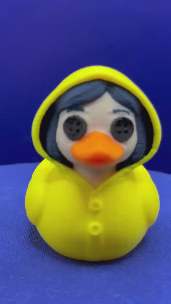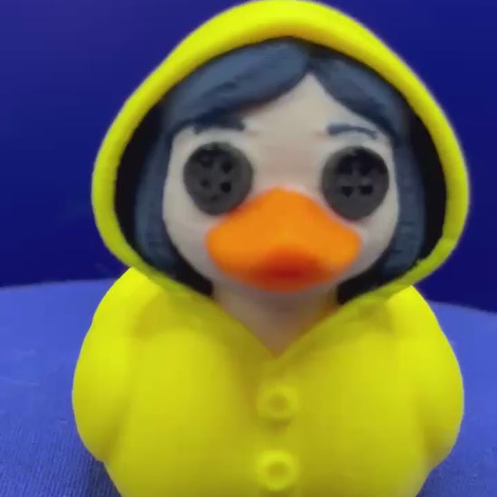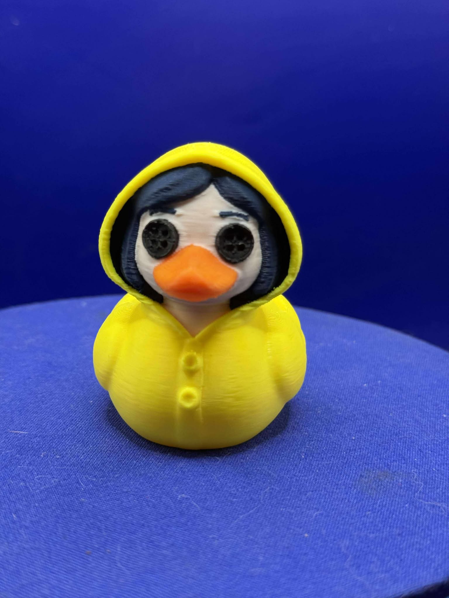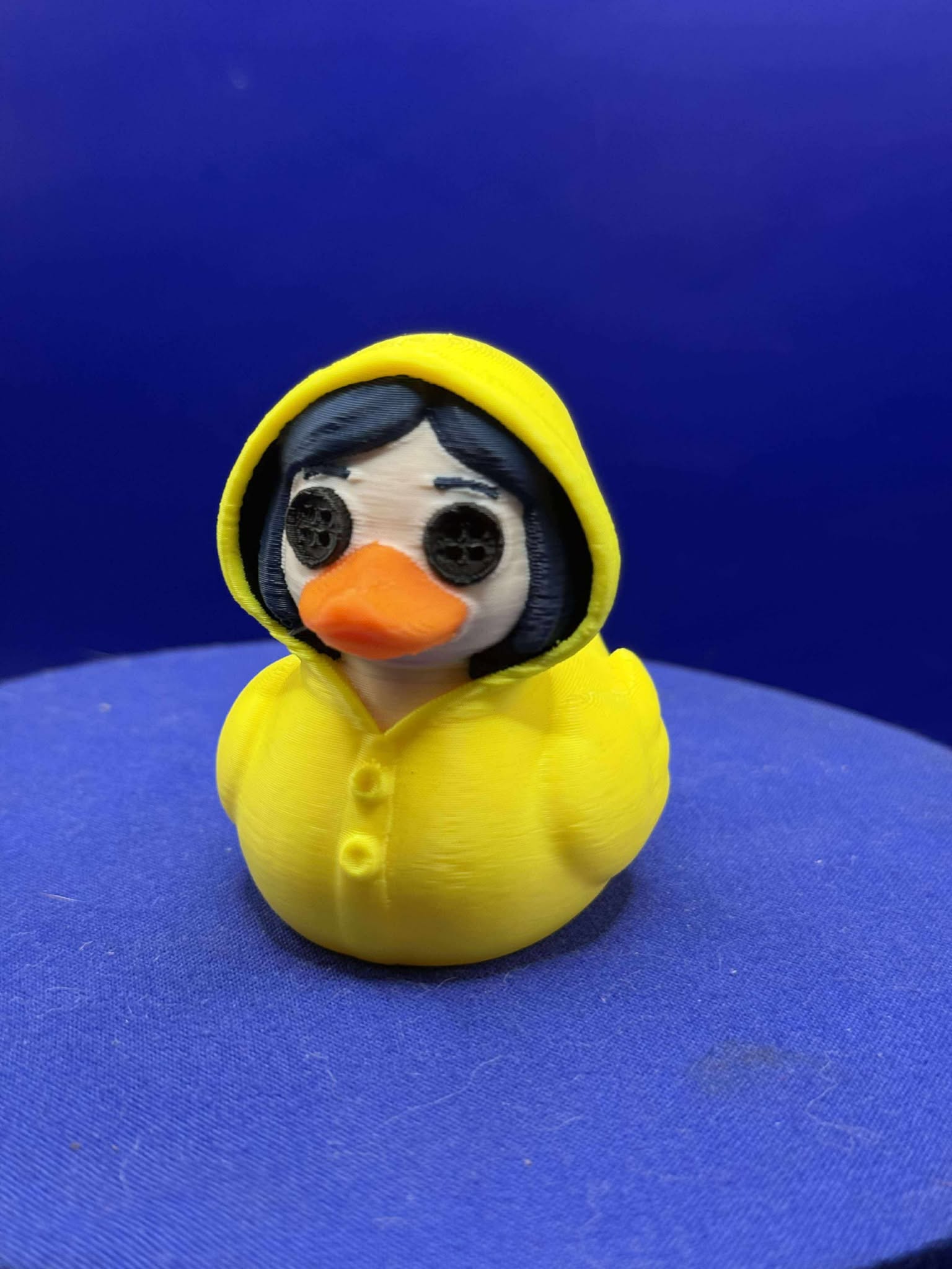 Step into the Other World with the Coraline Duck — a hauntingly adorable tribute to the beloved stop-motion classic Coraline! 🧵✨ This 3D printed duck features Coraline’s signature yellow raincoat, blue hair, and spooky black button eyes, perfectly capturing the eerie charm of the movie.